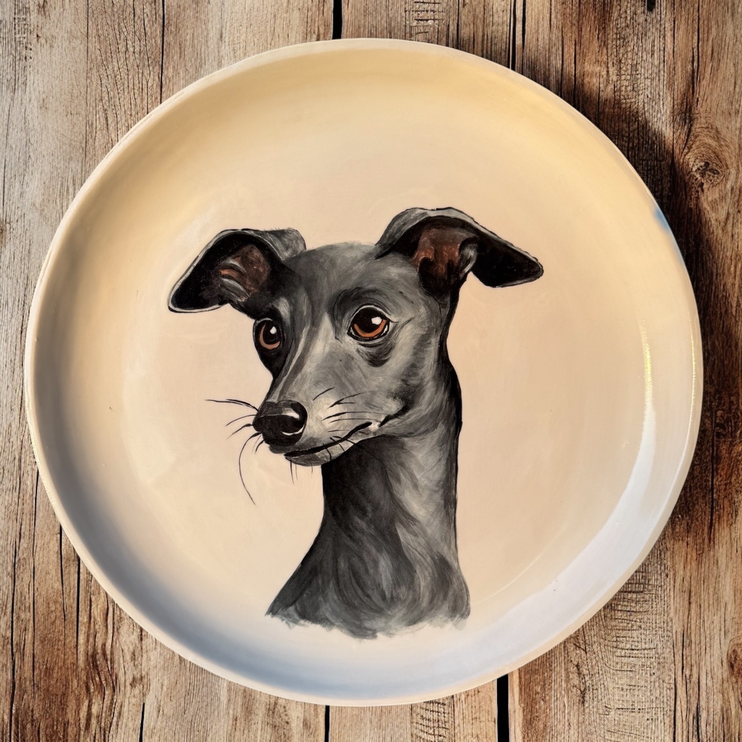 Elevate your home decor with this meticulously hand-painted decorative plate, featuring the dignified portrait of an Italian Greyhound. Crafted with attention to detail, this plate not only captures the essence of the breed but also serves as a stunning piece of art.