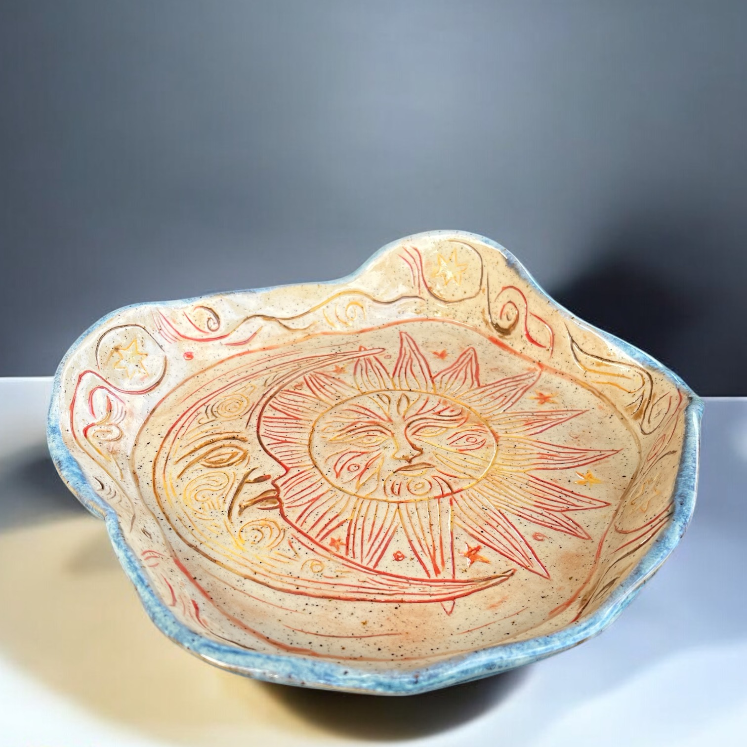 , it’s made from speckled clay, leaving a small, natural untreated section visible on the exterior for a raw, organic feel. The interior features a hand-etched celestial design with sun, moon, and star motifs. Dishwasher-safe and durable, this bowl is perfect for serving snacks, fruits, or as a decorative statement piece.